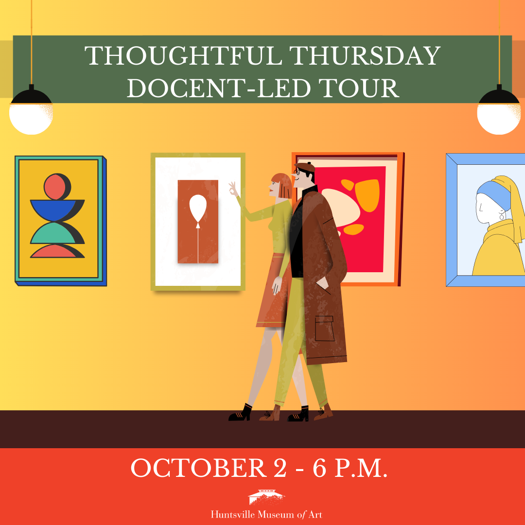 Thursday, October 2 Thoughtful Thursdays Docent-Led Tour Selection of Wine 5 p.m. – 8 p.m. Tour: 6 p.m. Members: Free | Non-members: $5 Join us for a relaxing Thursday evening at the Huntsville Museum of Art! Enjoy $5 admission from 5 p.m. to 8 p.m., and explore the latest exhibitions or revisit your favorite pieces [...]