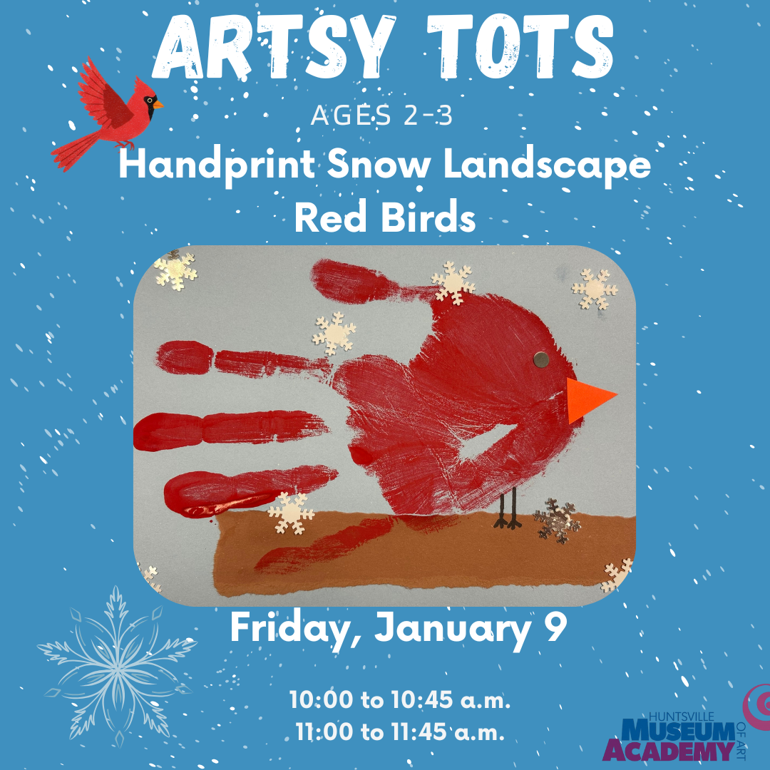 Join the Huntsville Museum of Art Academy for Artsy Tots as we make Handprint Snow Landscape Red Birds January 9 from 10:00 - 10: 45 or 11:00 - 11:45 Registration is required The program introduces toddlers between the ages of 2 and 3 to art and to the Museum through artful short stories, gallery [...]