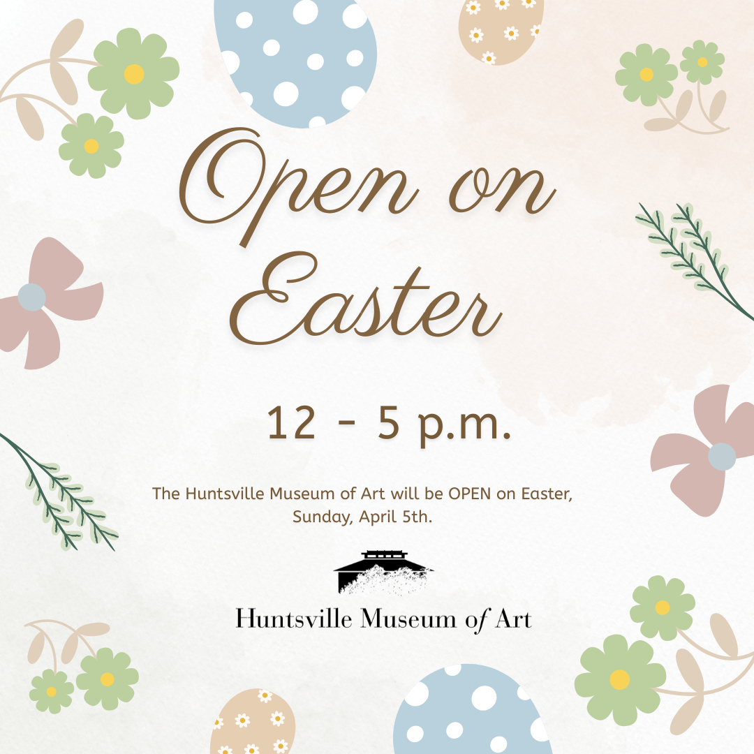 Huntsville Museum of Art 300 Church Street S.W., Huntsville, AL, United StatesThe Huntsville Museum of Art will be OPEN on Easter, Sunday April 5 from 12 to 5 p.m. We hope to see you for a day of art and culture at the Huntsville Museum of Art.