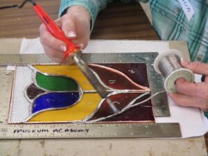 Learn about glass-cutting, patternmaking, copper foiling, soldering, and construction. Create an artful sun catcher using a technique of varied shapes of glass. Materials included. Space is limited to 6 students