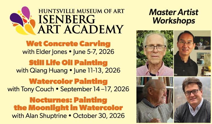 If you are interested in a Master Artist Workshop that is SOLD OUT, please email your name and phone number to Laura E. Smith, Director of Education and the Isenberg Art Academy at lsmith@hsvmuseum.org to be added to the wait list. Members registration fee refers to Huntsville Museum of Art members.